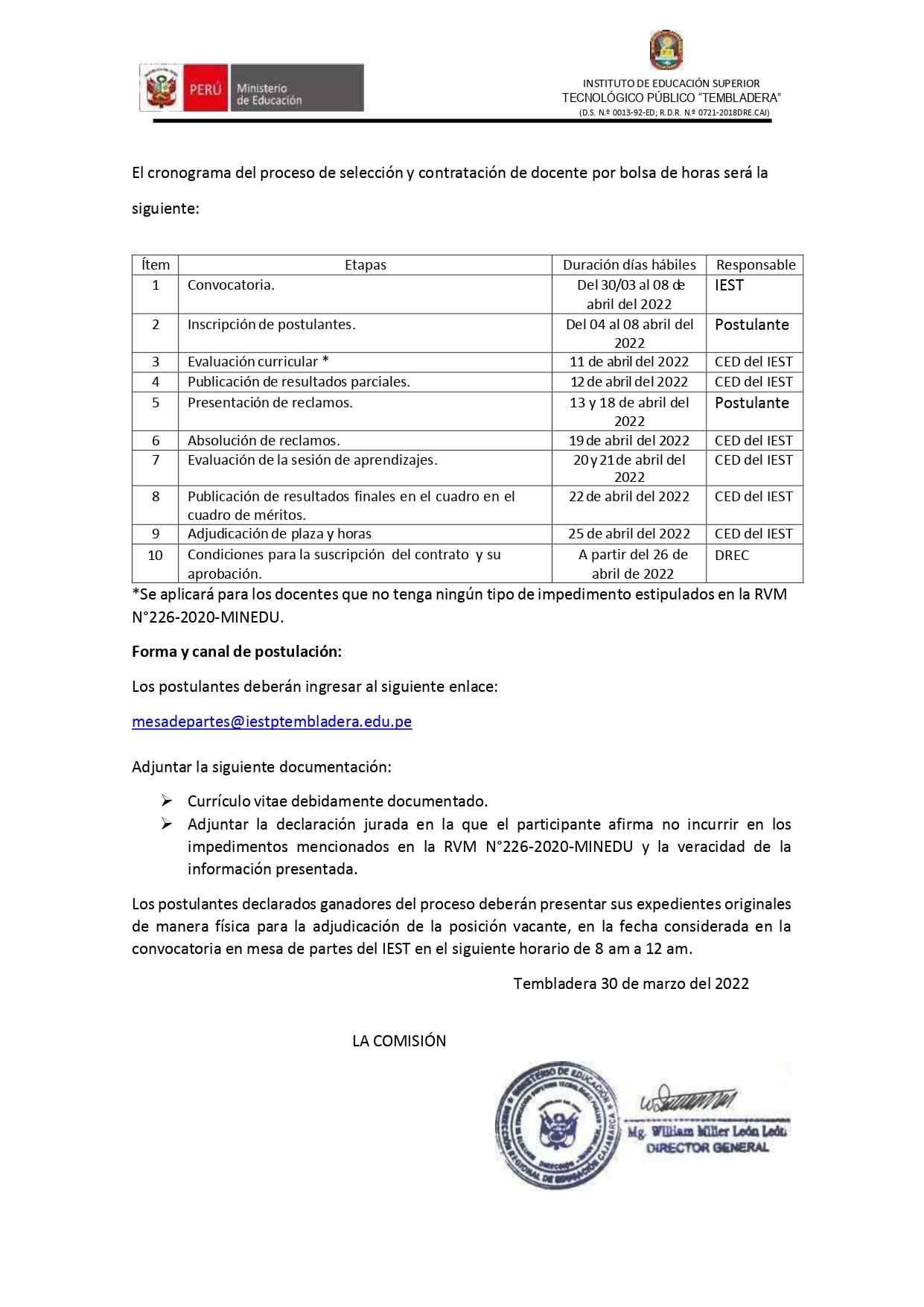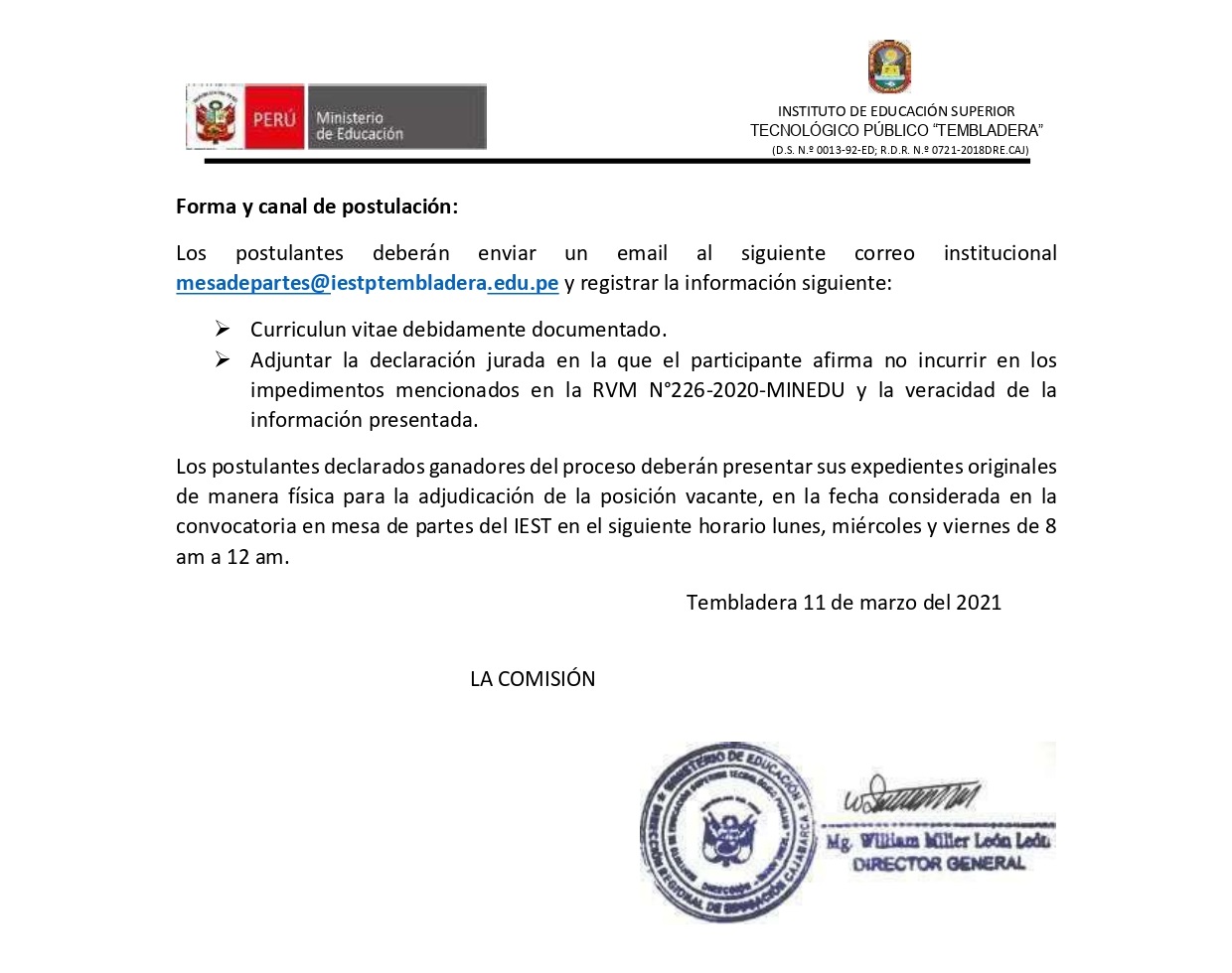 Enviar curriculum vitae documentado y declaración Jurada a: mesadepartes@iestptembladera.edu.pe