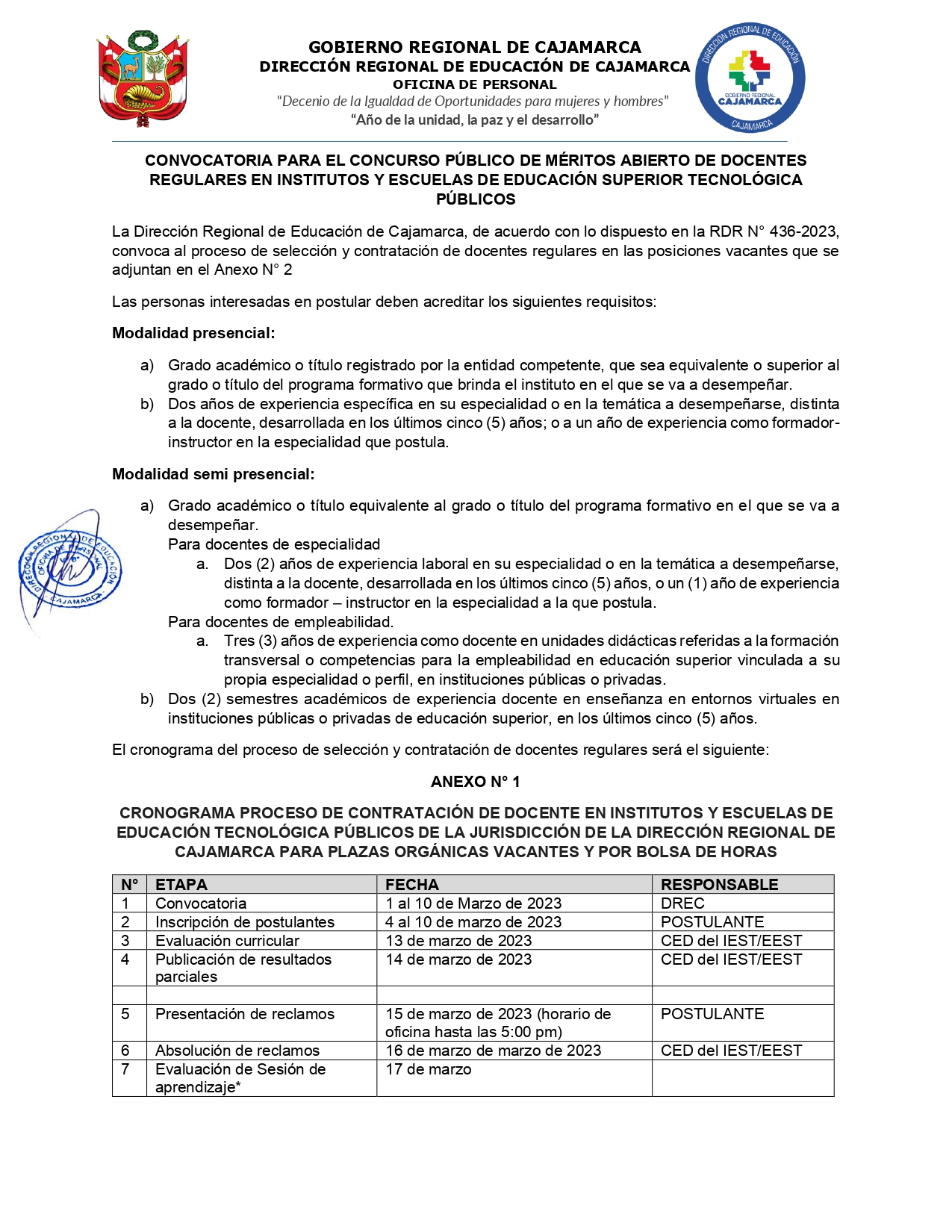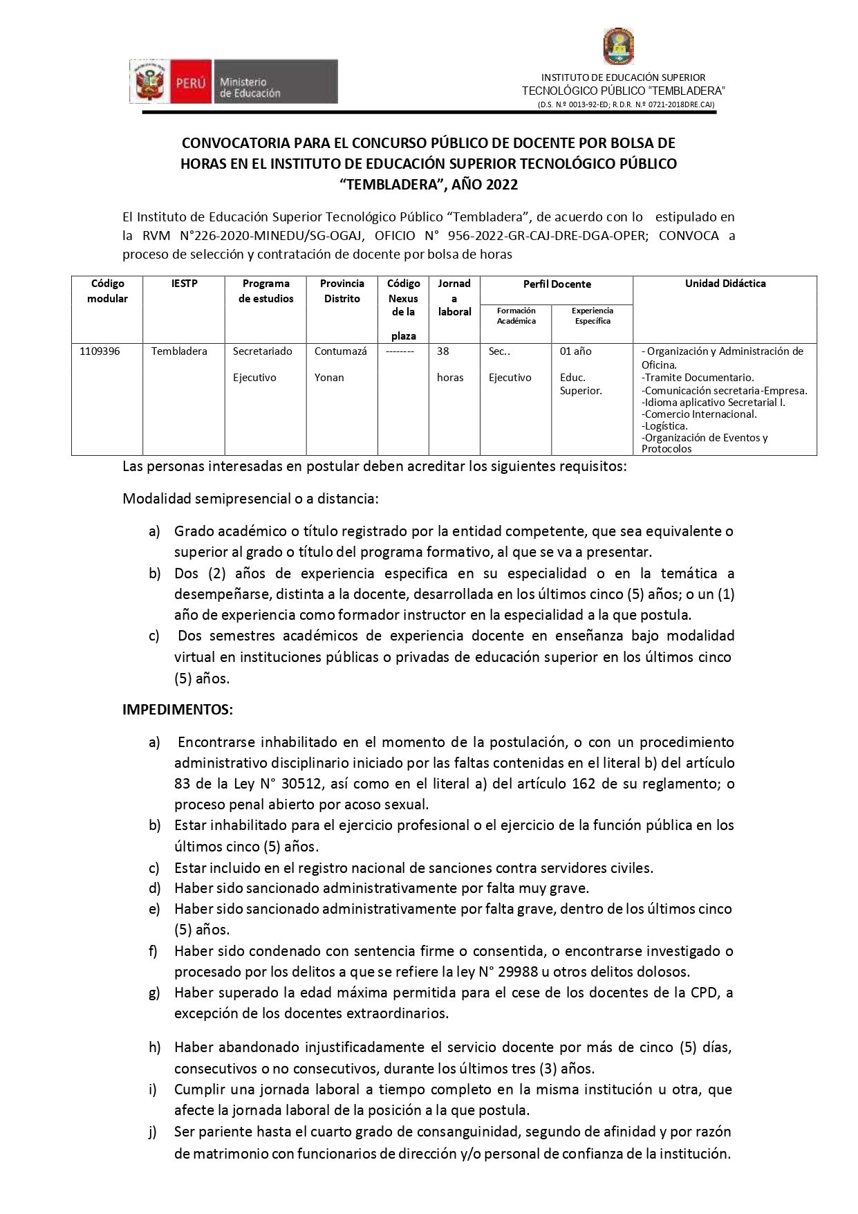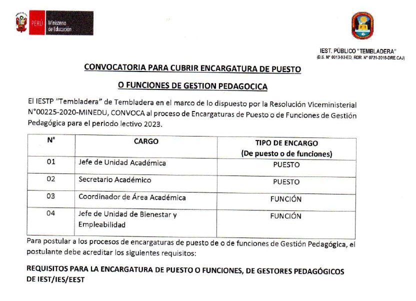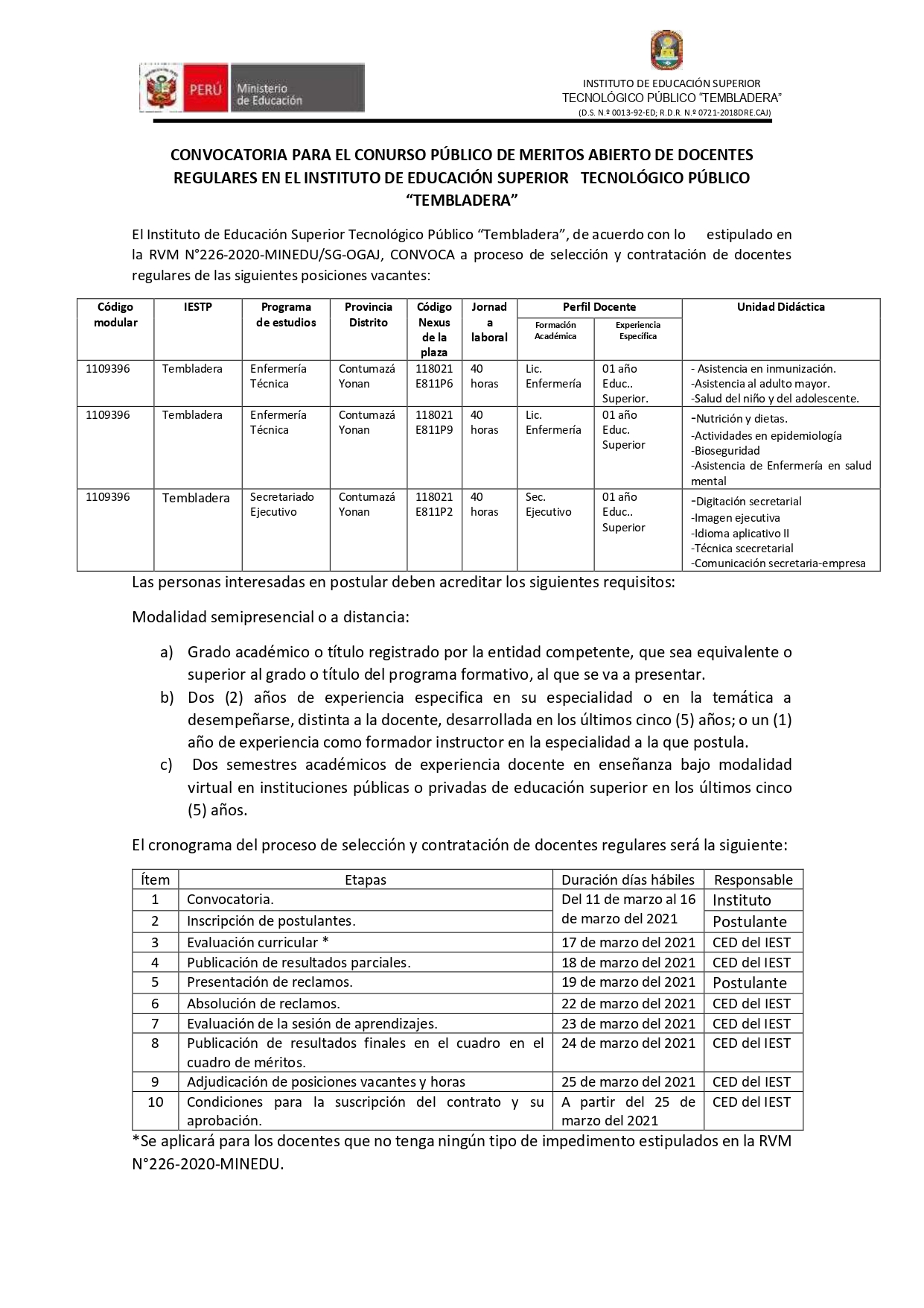 CONVOCATORIA PARA EL CONCURSO PÚBLICO DE MÉRITOS ABIERTO DE DOCENTES REGULARES EN EL INSTITUTO DE EDUCACIÓN SUPERIOR TECNOLÓGICO PÚBLICO “TEMBLADERA”