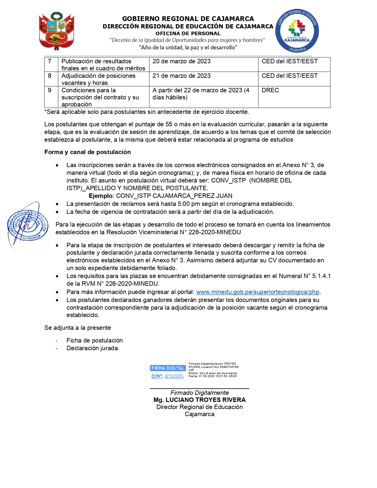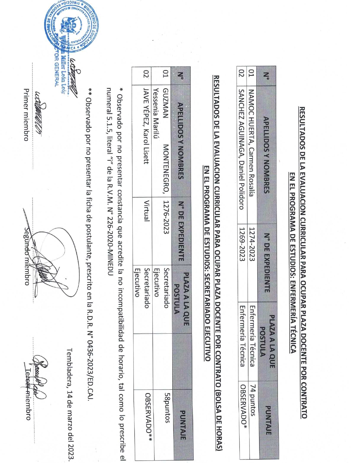 Resultados Finales del Concurso para ocupar plaza docente por contrato en el IESTP "Tembladera"