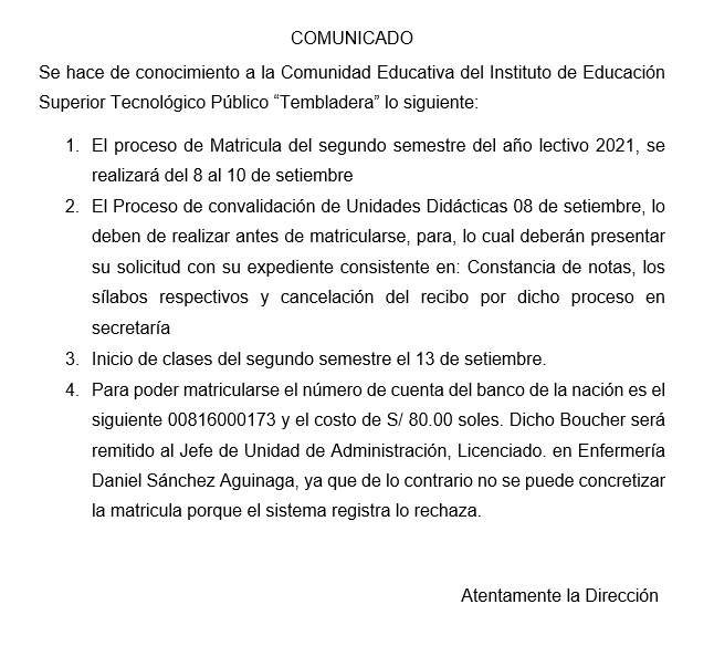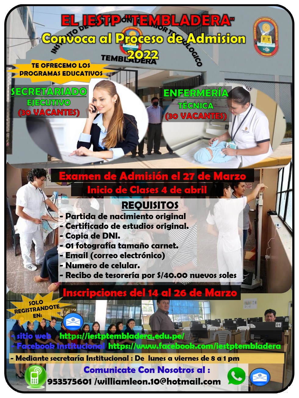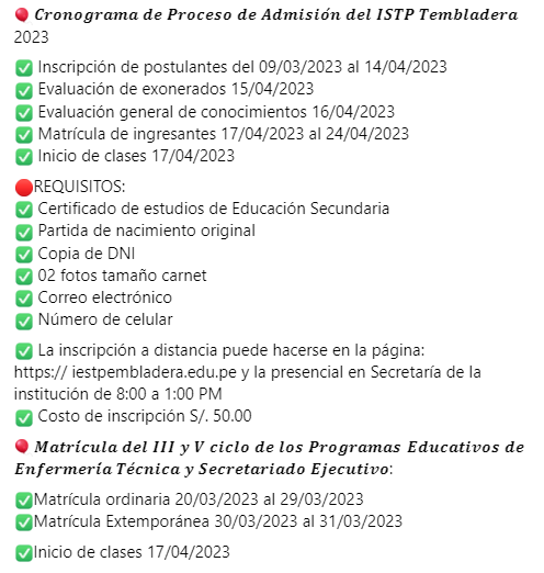El proceso será de 𝐦𝐚𝐧𝐞𝐫𝐚 𝐩𝐫𝐞𝐬𝐞𝐧𝐜𝐢𝐚𝐥 en horario de atención de 8 am a 1pm en secretaria del IESTP Tembladera.