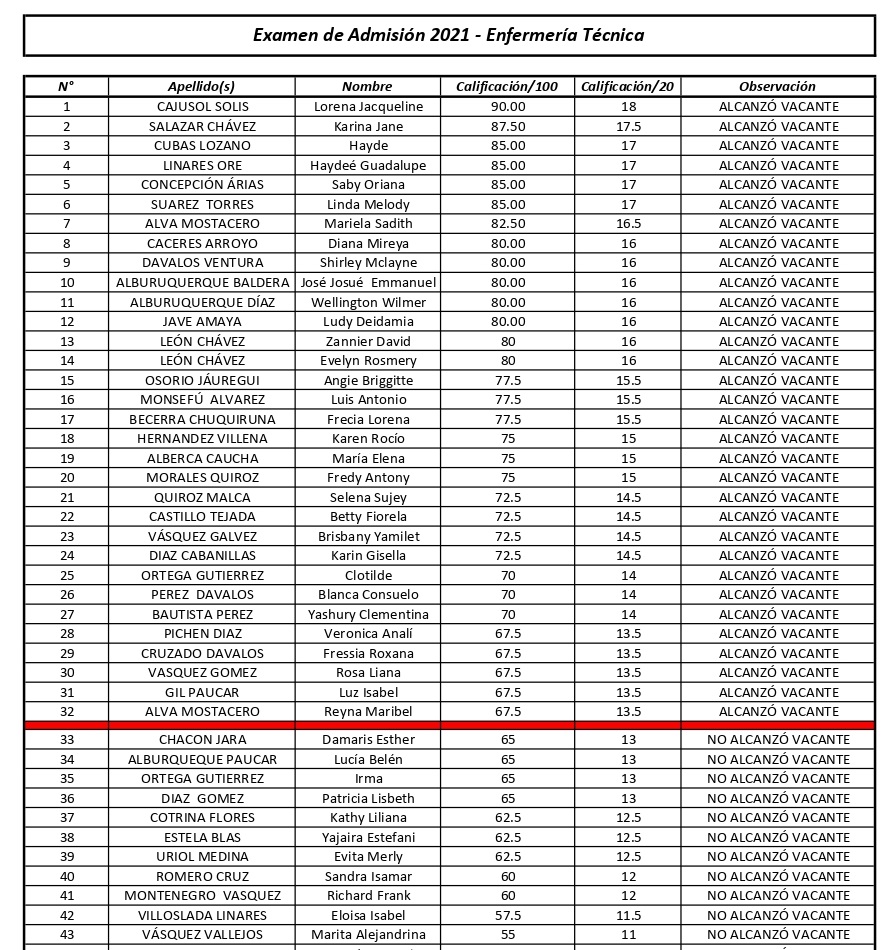 RESULTADOS - ADMISIÓN 2021 - Enfermería Técnica